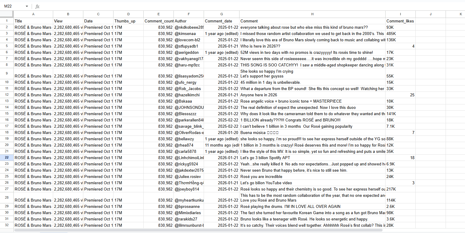 En este punto, has creado un bucle en Python que recorre los comentarios del video de YouTube y, en cada iteración, añade los comentarios extraídos a la variable.