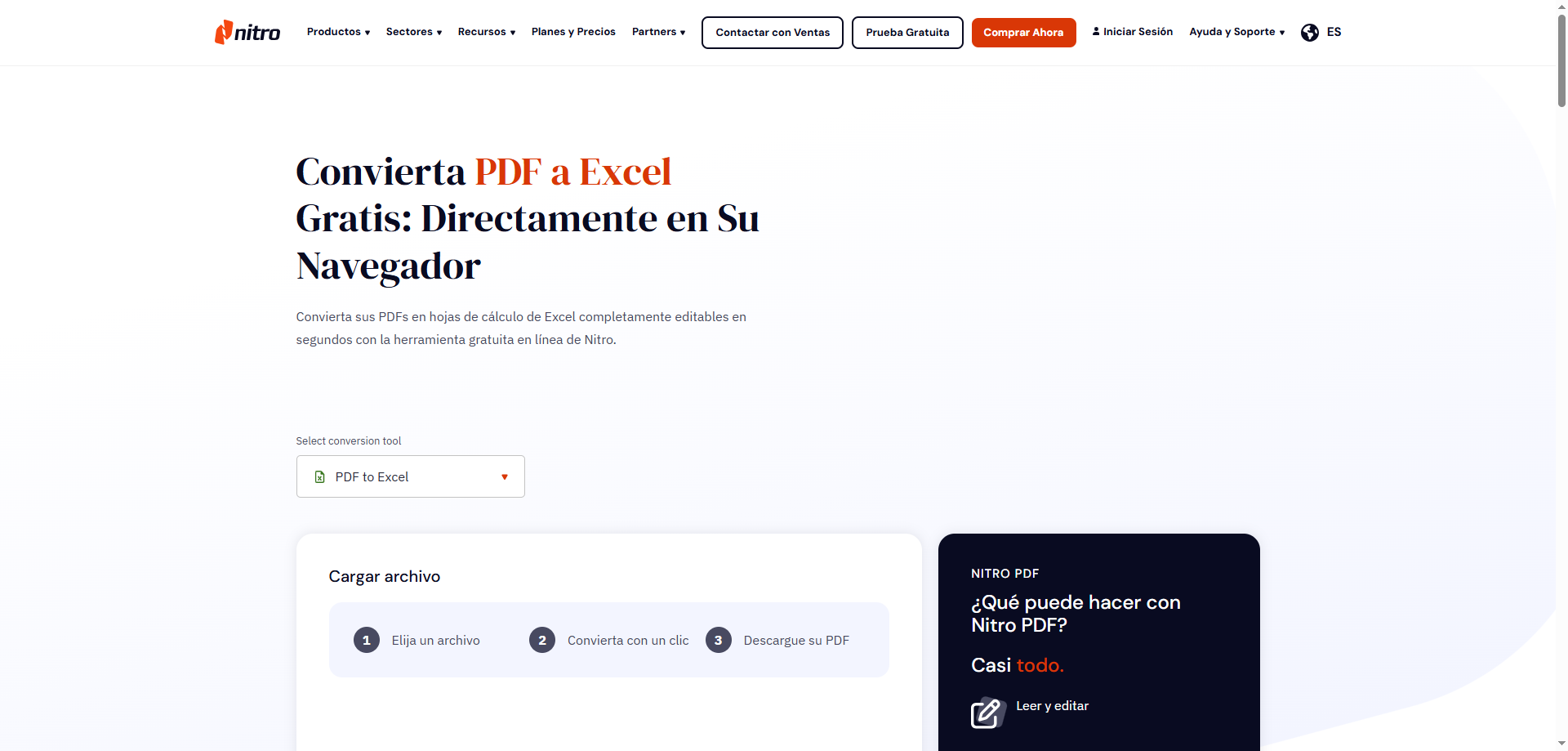 El convertidor de PDF a Excel de Nitro también ofrece versión con interfaz en español.