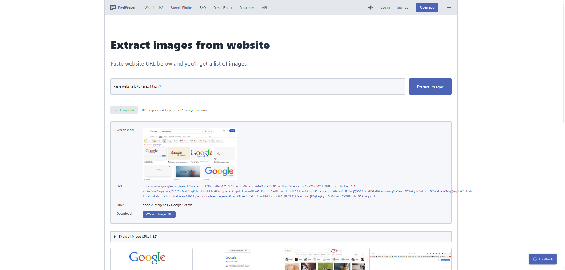 Una característica destacada es que puede detectar imágenes desde páginas de resultados como Google Images, algo que no todos los extractores online consiguen realizar correctamente.