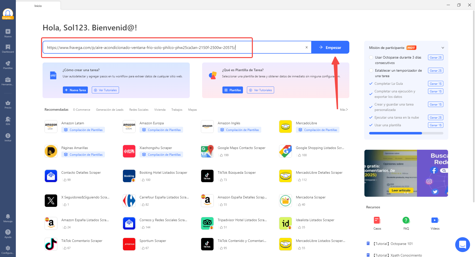 - Paso 2: En la página principal del cliente, pegue directamente la URL de la página que desea extraer y haga clic en Empezar.