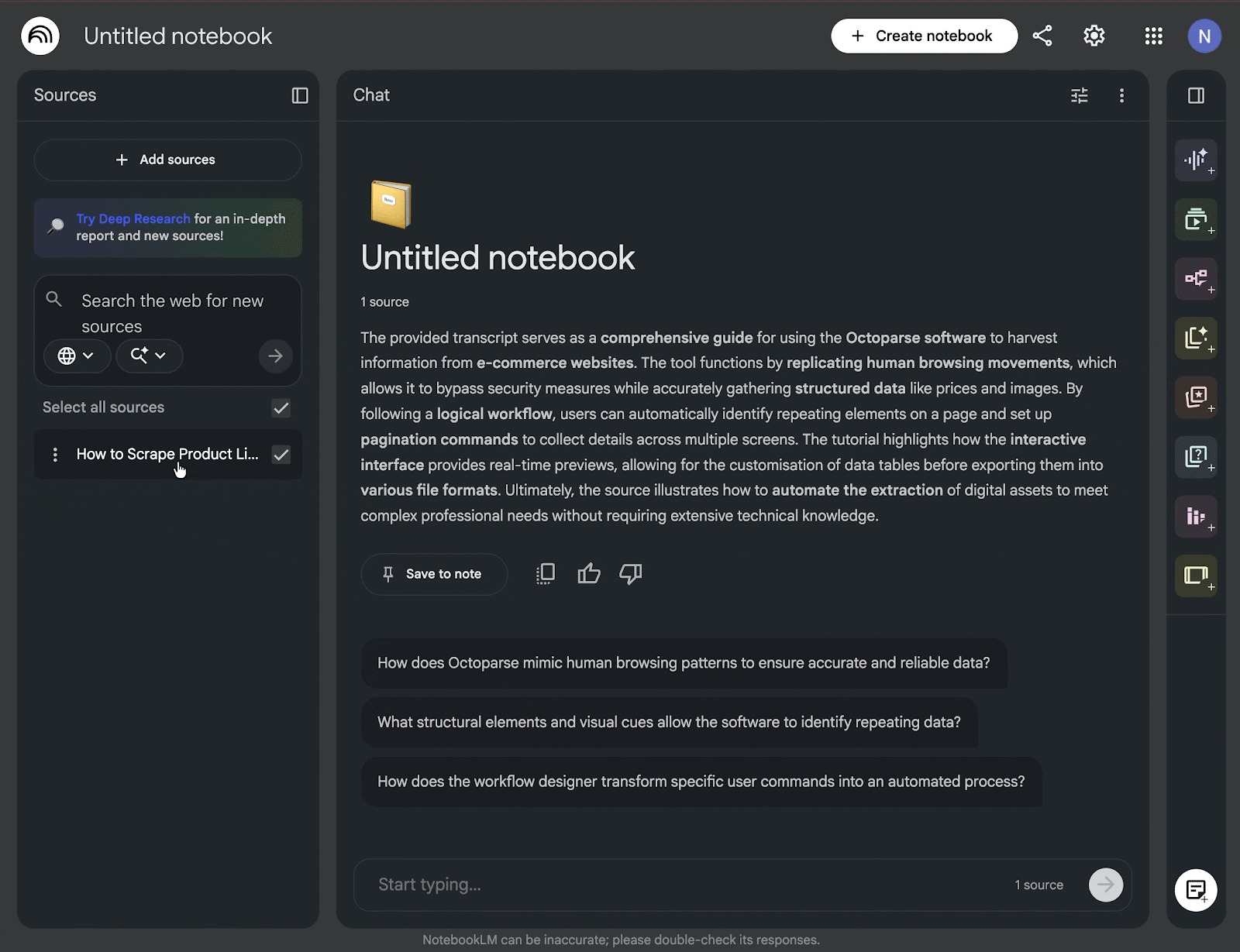 Intenté añadir el enlace de un vídeo de YouTube de Octoparse y, en la sección de fuentes, puedo ver la transcripción completa, como se muestra a continuación.