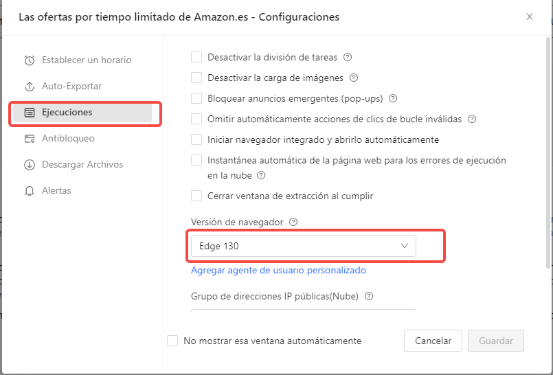 Accede a la configuración de la tarea y selecciona Edge 130 como versión del navegador.