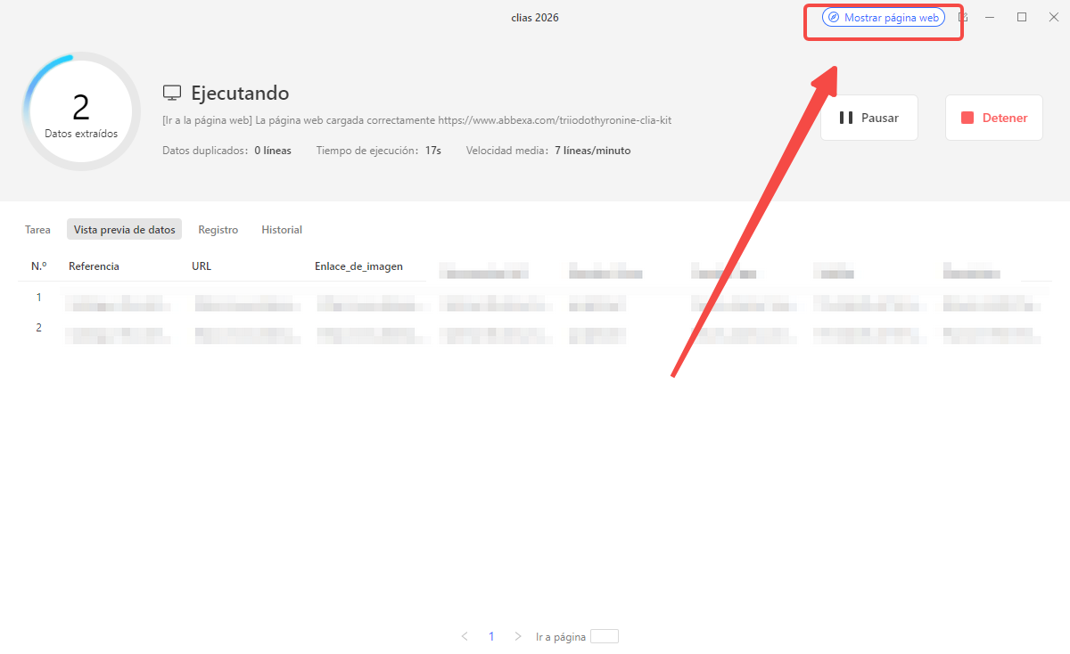 Durante la ejecución, haz clic en “Pausar” y luego en “Mostrar página web” para resolver el CAPTCHA directamente en el navegador. Una vez completado, selecciona “Continuar” para continuar con la tarea.