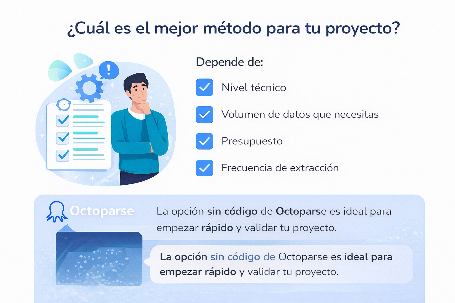 En muchos casos, empezar con una solución sin código como Octoparse es la forma más rápida y eficiente de validar un proyecto antes de pasar a enfoques más técnicos.