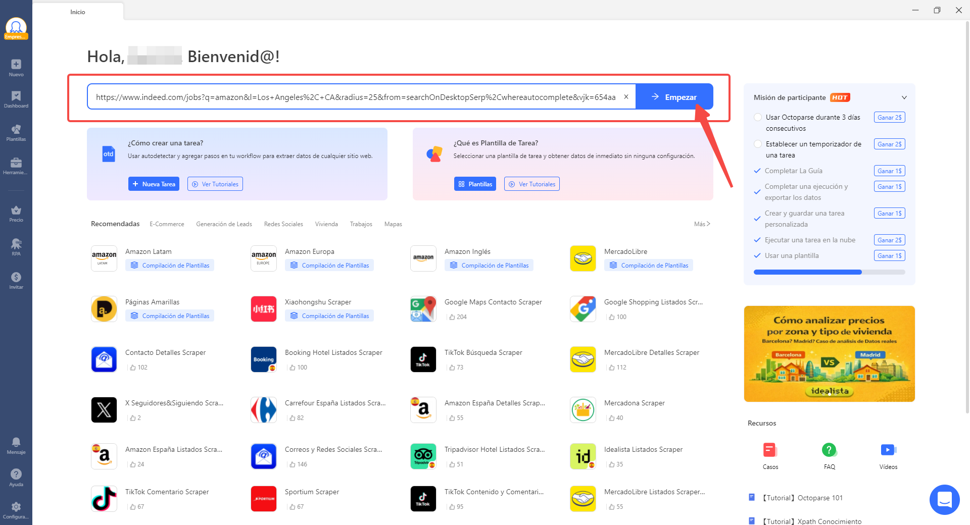 Una vez abierto, pega la URL de Indeed que deseas scrapear en la interfaz principal y continúa.