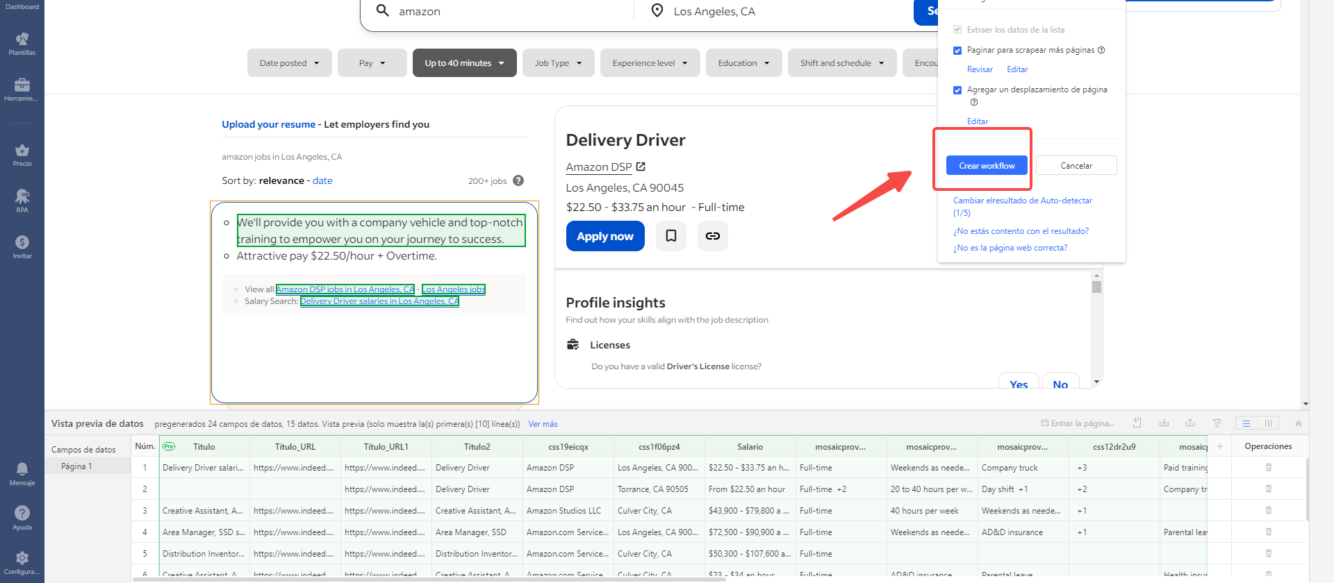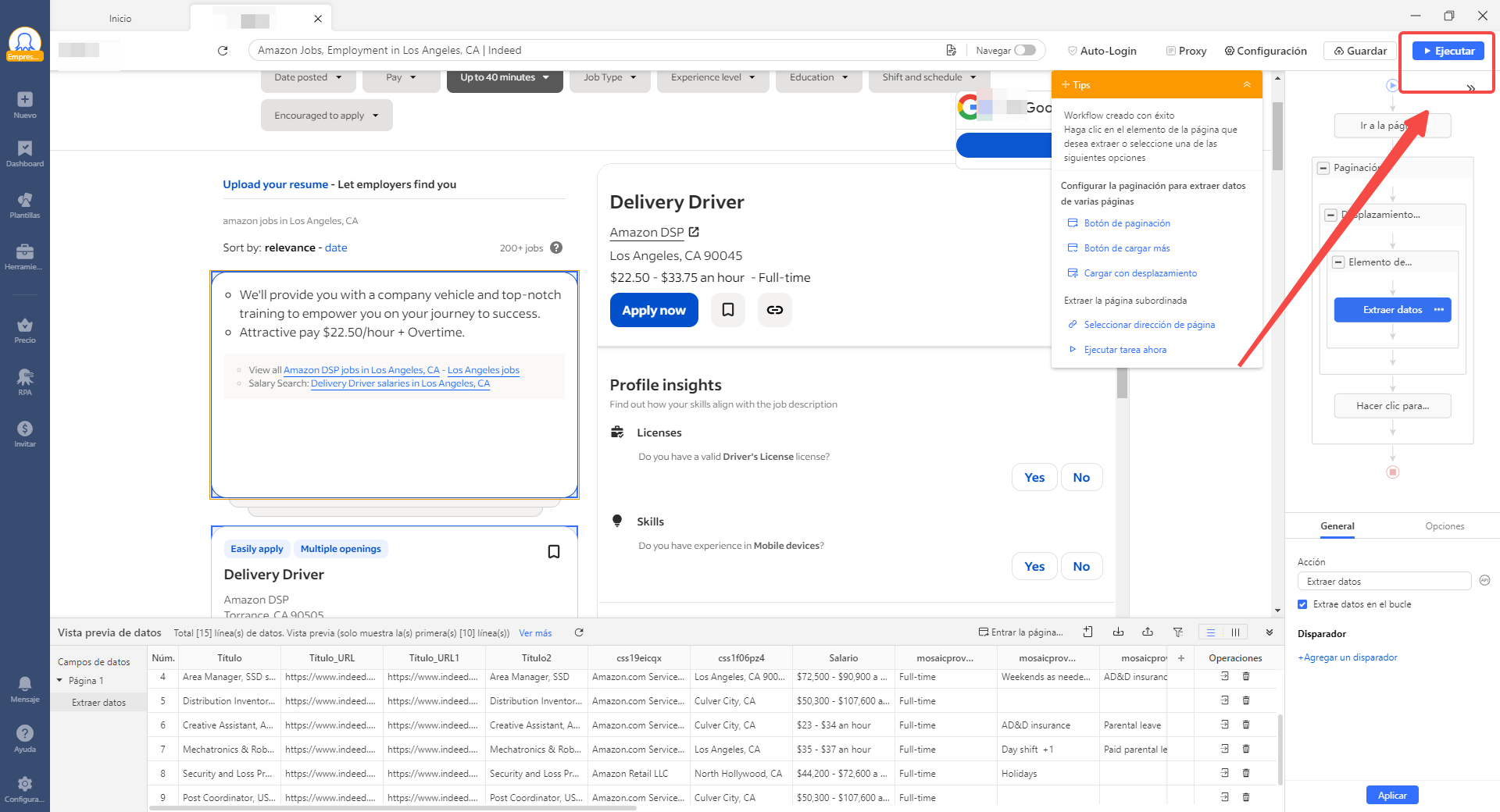 Crea el flujo de trabajo y configura la paginación si necesitas extraer datos de varias páginas.