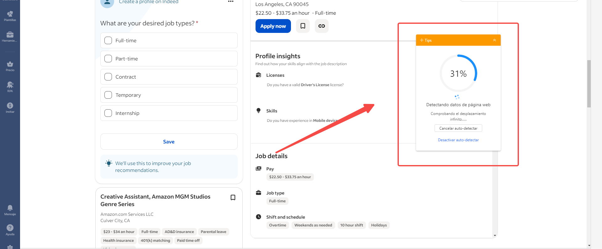 También puedes usar el modo de detección automática o las plantillas preconfiguradas para Indeed, lo que permite completar el proceso de forma casi totalmente automática.